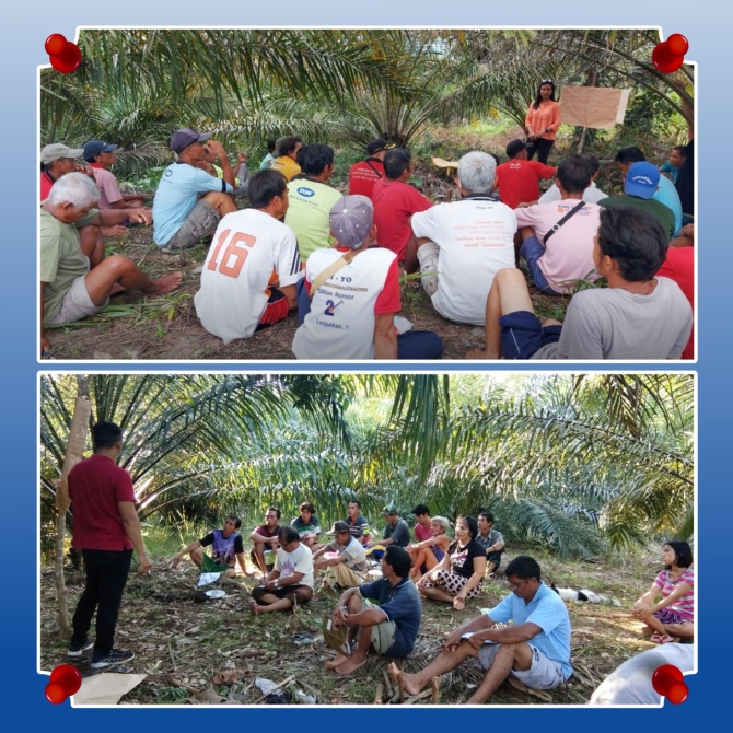 Kelas sekolah lapang ini selalu mengkombinasikan teori dan praktek. Para peserta belajar secara langsung di kebun sawit milik anggota kelas. Secara sukarela, mereka mengizinkan kebunnya menjadi tempat belajar. Mereka pun konsisten mengikuti tujuh kali pertemuan dalam program ini.